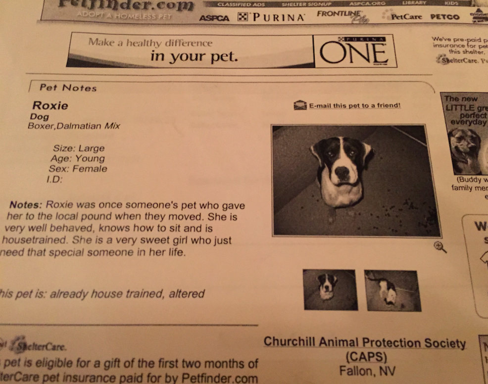 Roxie was a special dog, and we had a very unique bond. I found her on a website called Petfinder.com after I accidentally forgot to click the “stay in state” option. She was in Nevada, about a five-hour drive from San Francisco. I had looked at probably 400 dogs before getting to her. There was something about the way that she sat looking at the camera that won me over. She had been abandoned and had traits that I don’t always love. She was needy, clingy, jealous and obsessive about me. But she had winning traits too, extreme loyalty, sensitivity, a very sweet nature and naturally polite manners. When we were together, she was perfect. But when we were apart, she would become hysterical, trying to chew her way through the door to find me. I hired pet psychologists, behaviorists, even a pet psychic to try to deal with her issues. Nothing worked until finally, I adopted two kittens so she would have company. With her cats, she could finally cope with my absence.